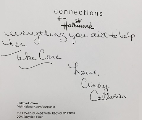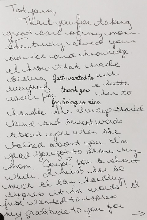 “Thank you for taking great care of my mom. She truly valued your advice and knowledge. I know that made dealing with everything a little easier for her to handle. She always shared kind and sweet words about you… I just wanted to express my gratitude to you for everything you did to help her.”